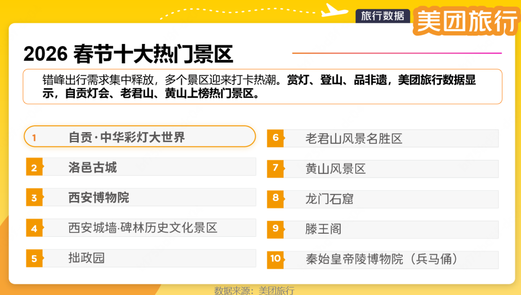 好意思团旅行数据显现,kaiyun sports自贡·中华彩灯大寰球、洛邑古城、西安博物院、西安城墙·碑林历史文化景区、拙政园、老君山表象古迹区、黄山表象区、龙门石窟、滕王阁、秦始天子陵博物院(戎马俑)等成为春节时辰最受迎接的景区。