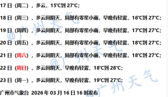 3月17日,广东中西部市县多云间阴天,清晨有轻雾,局部有荒芜小雨,其余市县晴转多云。最低气温:粤北、珠三角北部和西部、粤东偏北市县12~16℃,雷州半岛市县19~21℃,其余市县16~19℃。