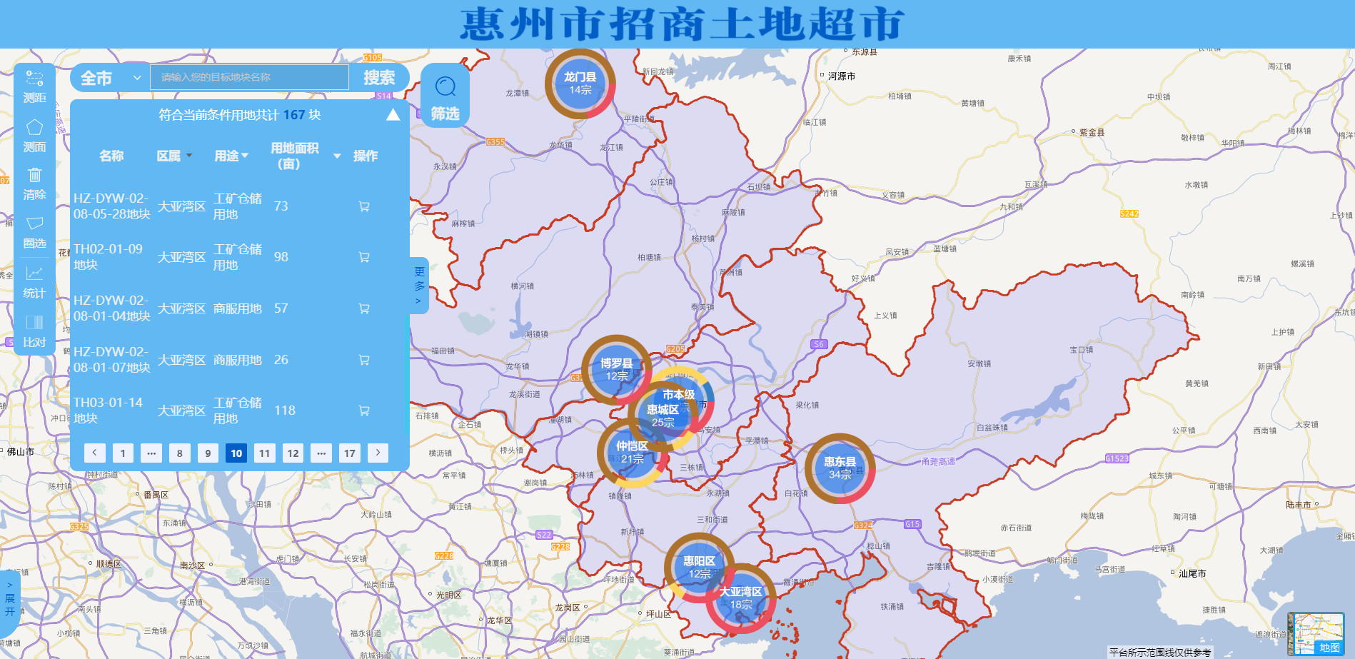 现时,首期上线用地167宗,共计面积约13040亩,约1200多个足球时局积大小,为投资者快速诱导满意地块,让企业一图看遍惠州投资商机。
