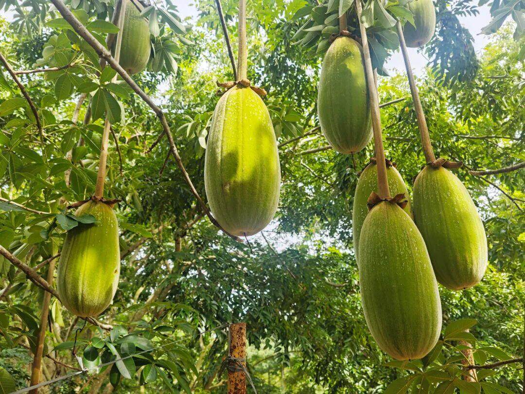 最引东谈主注指标,是树上吊挂着的一个个硕大果实,像绿色的炮弹千里千里坠在枝端。记者目测,单株能挂果两百多个,最重可达十几斤。苗木合营社负责东谈主林荣振先容,若是剖开坚毅的外壳,内部是酸爽好意思味的果肉,既能生吃,又能磨成粉作念面包、冲饮料,甚而当调味料。