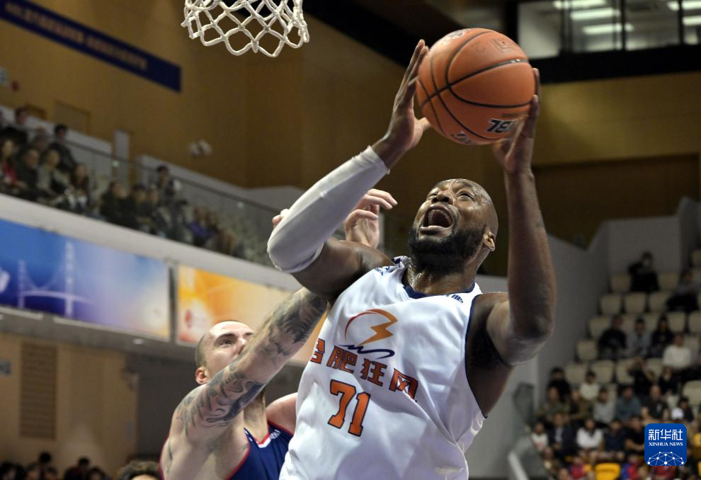 2月24日,合肥暴风队球员阿格拉瓦尼斯(中)在比赛中上篮。新华社发(卢炳辉摄)