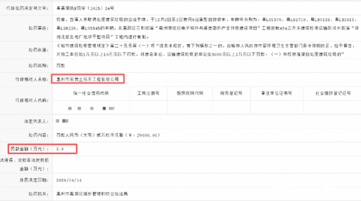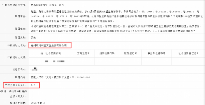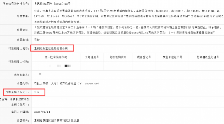行政处罚决定书表示(粤惠阳执E罚字〔2025〕33号),惠州市利宝达运载有限公司相似未得到解决配置垃圾的正当手续,于2025年12月4日,使用8台重型自卸货车,将348立方米配置垃圾从工地转运至新圩长布受纳场进行倾倒。