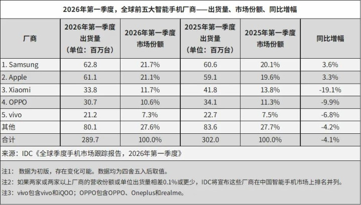 2026年4月音讯:闻明调研机构IDC发布的叙述显现,2026年第一季度人人智高手机出货量同比下跌4.1%至2.897亿台,按捺了自2023年第三季度以来清楚十个季度的增长势头。