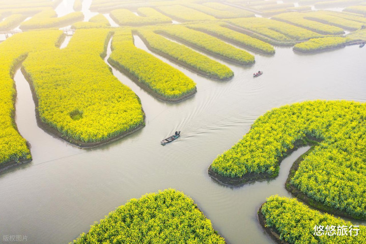 水网密布的江苏兴化,于湖荡地区东说念主工堆成高于水面的田垛。体式别离的垛田,互相分离,四面环水。坐摇橹船穿梭于垛田间,多个瞭望塔,可登高远眺油菜花海。