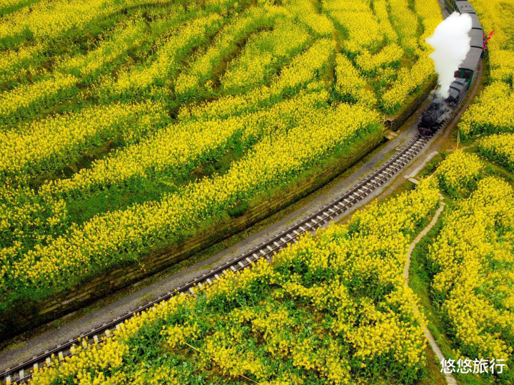 乌绿色的车厢,车头冒着蒸汽裹着煤烟,一头扎进段家湾的油菜花海。金黄的花穗擦着车窗,花瓣落在肩头,是春日的柔嫩。