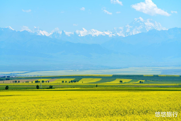 7月中旬的昭苏是多彩的,油菜花、紫苏花、向日葵、麦田,不同色块的花海填满了地面,花海蔓延至雪山眼下。577国说念左近的田园,基本都是大片的花田。