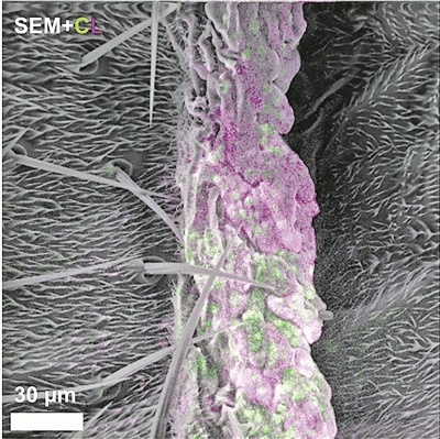 团队讲解谈,他们确立的新技巧不辐照色泽,而是辐照电子束。他们确立了一种稀奇探针,可附着在见解卵白上。当电子束激励探针时,其会发出可见光,此历程称为“阴极发光”。于是,吞并束电子束便能提供两组重要信息:探针发出的彩色信号,以及电子散射造成的考究结构图像。该技巧已在哺乳动物细胞及生物组织(如受真菌侵染的果蝇)中考证灵验。
