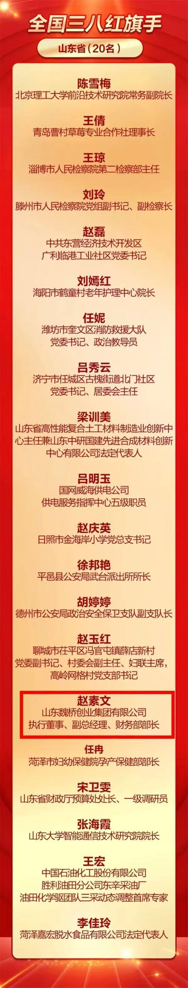 在这次赏赐中,山东魏桥创业集团有限公司奉行董事、副总司理、财务部部长赵素文荣获“宇宙三八红旗头”称呼。行动企业财务掌舵东说念主,她聚焦“革命魏桥”“数智魏桥”建设,教唆团队建树粉饰全集团的数字化财务分享平台,以精良化惩处和多元化融资渠说念赋能企业高质地发展。同期,她积极践诺社会包袱,参与公益助学,切实为女工办实事解难事,曾获山东省三八红旗头、宇宙纺织工业工作圭臬等称呼。