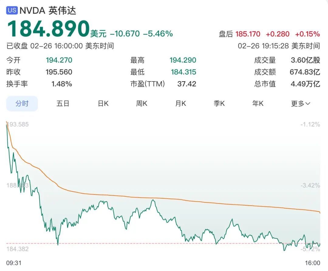 当地时刻2月26日,好意思股三大指数收盘涨跌不一,大型科技股广泛下落,英伟达(NVDA)股价大幅跳水,单日跌幅超5%,市值通宵之间挥发超2700亿好意思元(约合东说念主民币1.77万亿元),创下自客岁4月16日以来近11个月的最大单日跌幅。驱散当日收盘,英伟达股价报184.89好意思元,较前一交畴前下落10.67好意思元,跌幅达5.46%,换手率1.54%,成交量达3.6亿股,成交额675亿好意思元,创下近期单日成交量新高,总市值降至4.49万亿好意思元。