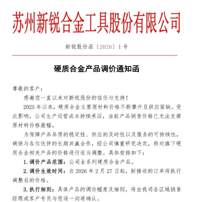2月26日,新锐股份(SH688257,股价59.93元,市值151.27亿元)通过官方微信公众号发布硬质合金产物调价见知函。函件中,新锐股份默示,自2025年以来,硬质合金主要原材料价钱握住攀升且供应紧缺。受此影响,公司分娩运营本钱握续承压,面前产物销售价钱已无法复旧原材料价钱涨幅。